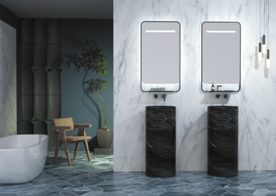 Cuadrado con cantos redondeados y marco de aluminio en acabado negro mate. Anti-vaho incorporado Disponible en tres tipos de