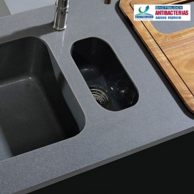 Estos fregaderos están fabricados con resinas y reforzados con cargas minerales naturales (cuarzos, sílices, alúminas), debido a estos materiales poseen propiedades antibacterias. además de facilitar la limpieza, ya que se puede usar productos anti calcáreos ,legía,e incluso acido Clorhídrico .