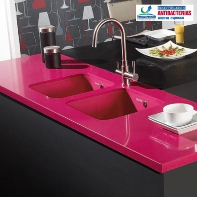 Estos fregaderos están fabricados con resinas y reforzados con cargas minerales naturales (cuarzos, sílices, alúminas), debido a estos materiales poseen propiedades antibacterias. además de facilitar la limpieza, ya que se puede usar productos anti calcáreos ,legía,e incluso acido Clorhídrico .