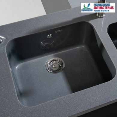 Estos fregaderos están fabricados con resinas y reforzados con cargas minerales naturales (cuarzos, sílices, alúminas), debido a estos materiales poseen propiedades antibacterias. además de facilitar la limpieza, ya que se puede usar productos anti calcáreos ,legía,e incluso acido Clorhídrico .