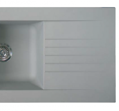 Fregadero sintético, con dos cubetas y un escurridor, fabricado por Sintetika, fabrica española dedicada a la fabricación de fregaderos desde hace varias décadas.