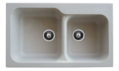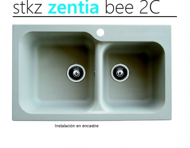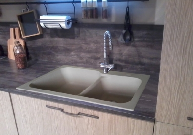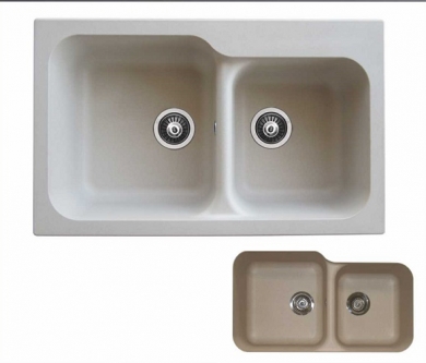 Fregadero sintético, con dos cubetas fabricado por Sintetika, fabrica española dedicada a la fabricación de fregaderos desde hace varias décadas.