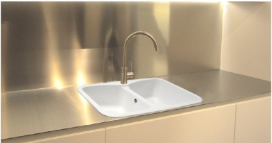 Fregadero sintético, con dos cubetas fabricado por Sintetika, fabrica española dedicada a la fabricación de fregaderos desde hace varias décadas.