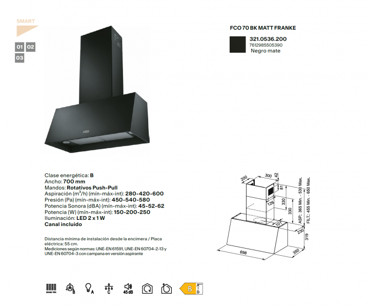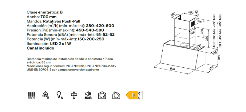 Con un ancho de 70 cm, esta campana decorativa de pared ofrece una capacidad de extracción de hasta 560 m³/h, asegurando una óptima eliminación de humos y olores. Dispone de 3 velocidades para adaptarse a las necesidades de cada momento, desde una cocción suave hasta un uso más intensivo.