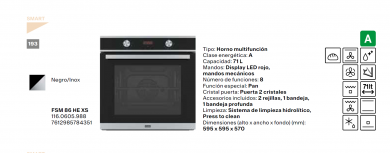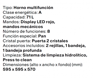 Equipamiento estándar 1 bandeja pastelera, 1 bandeja profunda, 2 parrillas