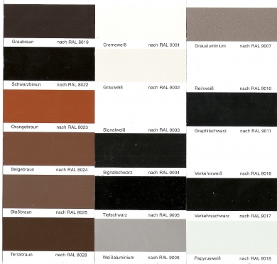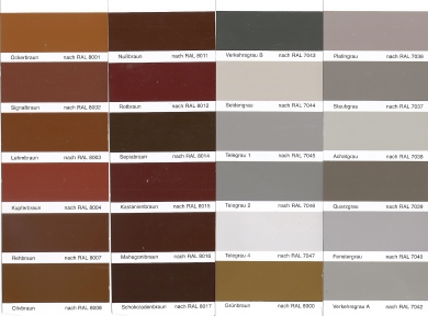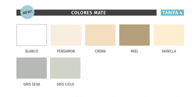Vainilla ,Arcilla, Marrón Beig, Café , Terracota,Gris seda, Cemento, Gris Cuarzo,Gris Cuarzo, Gris Hierro, Carbón.