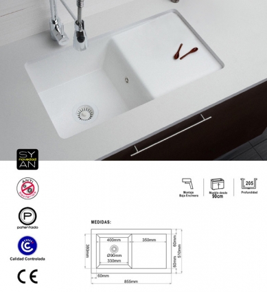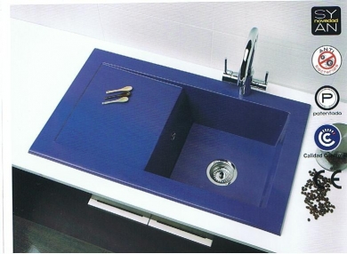 Los fregaderos SYAN están fabricados con resinas isoflálicas endurecidas con micro-esferas de vidrio y cuarzos y marmolinas, ofreciendo una especial resistencia al agua y al envejecimiento, abrasión y calor, y otorgandole propiedades Antibacterias