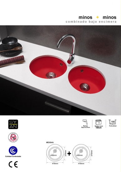 Los fregaderos SYAN están fabricados con resinas isoflálicas endurecidas con micro-esferas de vidrio y cuarzos y marmolinas, ofreciendo una especial resistencia al agua y al envejecimiento, abrasión y calor, y otorgandole propiedades Antibacterias