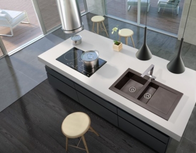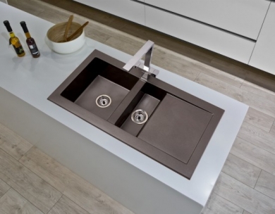 Los fregaderos SYAN están fabricados con resinas isoflálicas endurecidas con micro-esferas de vidrio y cuarzos y marmolinas, ofreciendo una especial resistencia al agua y al envejecimiento, abrasión y calor, y otorgandole propiedades Antibacterias,