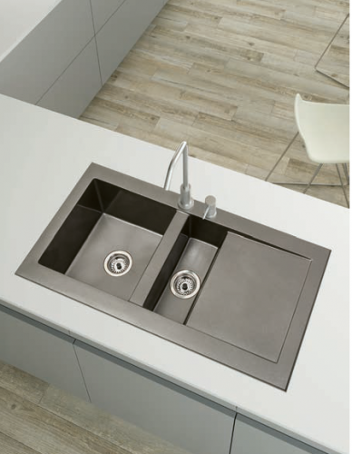 El fregadero ulises es un fregadero de dos cubeta y escurridor para montaje sobre encimera o bajo encimera . Se puede montar en muebles,desde 60cm, para montaje sobre encimera y para mueble desde 100cm para montaje bajo encimera