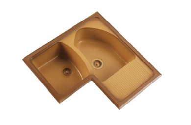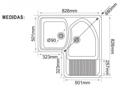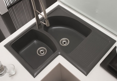 El fregadero Dédalo es un fregadero de dos cubeta y esquina para montaje sobre encimera . Se puede montar en muebles, con una anchura desde 90 cm . La profundidad del fregadero es de 190 mm.