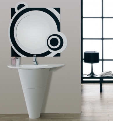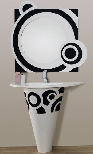 Conjunto Lavabo y Espejo Huracán doble color, de lineas curvas que aportan, alegria, modernidad al espacio mas intimo de tu hogar, fabricados en Stone, este material alcanza su gran calidad gracias a la combinacion de materias primas totalmente naturales como son el Cuarzo y la Mormolina que combinadas con el Poliester y resinas isoftálicas endurecidas e Isho-gel sanitario, le aporta una terminación de alta calidad resistente al rayado, a la degradación y la hidrólisis.
