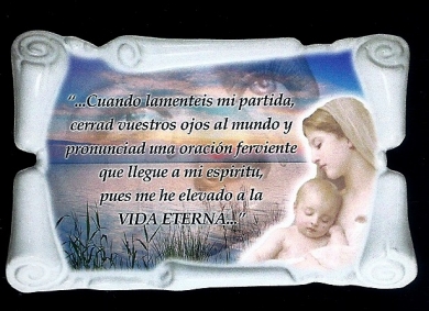 Pergamino de Cerámica, con los bordes en relieve , para crear el mejor recuerdo de tu ser querido, realizado con los últimos sistemas de impresión y modulación, resistentes a las inclemencias del tiempo, consiguiendo así que perdure como nuevo durante muchos años.