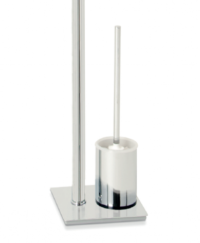 Escobillero con portarrollo y tollero de bidé giratorio, de esta manera se pueden orientar la barra del portarrollo donde se desee, ocupando el mínimo espacio.