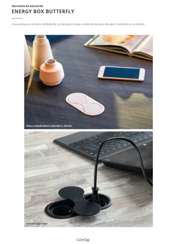 Energy box Butterfly con 2 enchufes o 1 enchufe + 1 USB cargadores en acabado inox y en acabado negro con 2 enchufes. Es muy fácil de instalar en casi todas las encimeras puesto que tiene sólo 46 mm de profundidad. Si se presiona en el centro del Butterfly, se hace girar la tapa a modo de alas para descubrir 2 enchufes en su interior. Después de utilizarlo, escondemos de nuevo los enchufes, acompañando el movimiento de las alas con la mano.