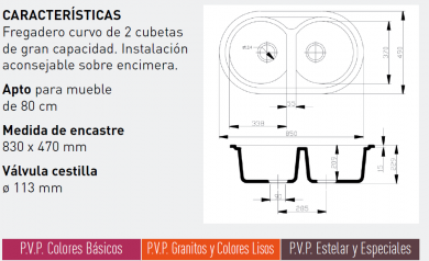 Fregadero curvo con 2 cubetas de gran capacidad.