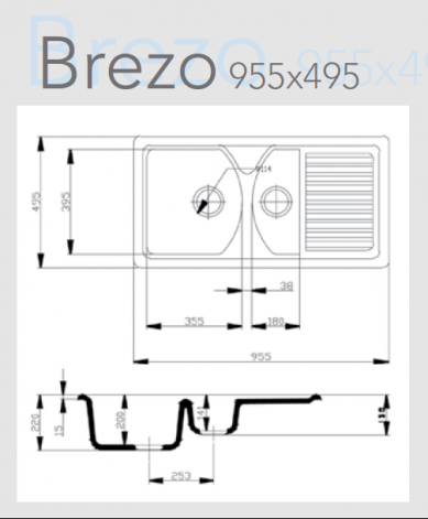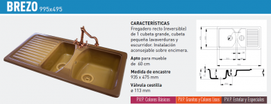 Fregadero recto (reversible) de 1 cubeta grande, cubeta pequeña lavaverduras y escurridor. Instalación aconsejable sobre encimera. Apto para mueble de 60 cm Medida de encastre 935x475 mm Válvula cestilla ø 113 mm