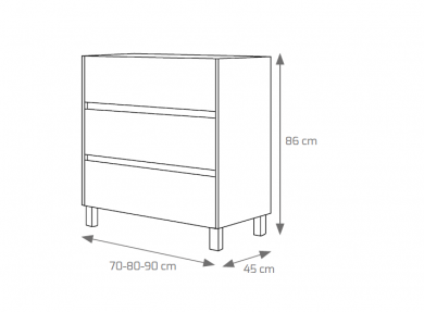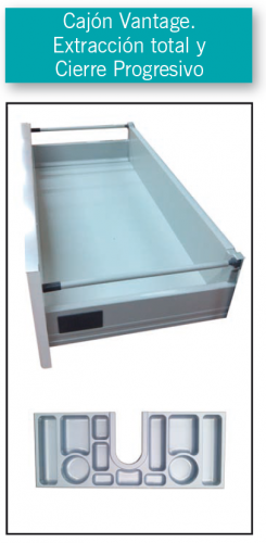 Con tres cajones de alta gama Blum, con extraccion total y bisagras metálicas con cierre progresivo