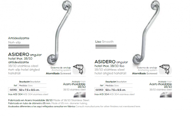 Asidero, agarrador, ergonómico para baño o ducha, acabado curvo, en acero inoxidable 18/10 con acabado en cromo o en blanco.