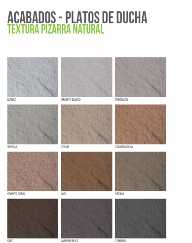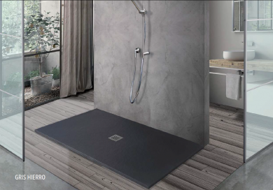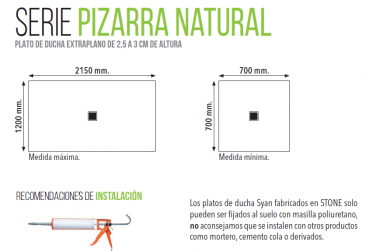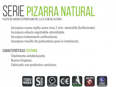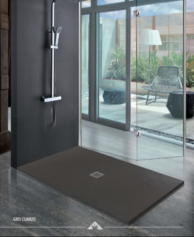 Plato de ducha de Pizarra natrual con Isho-gel, que es resistente a cualquier producto por abrasivo que sea, ademas son fabricados con una colorimetría, composicíon y estructura identicas, siendo totalmente uniforme el color de su interior con el de su exterior, este metodo de fabricacíon los hace resistentes a cualquier impacto que se produzca en el plato de ducha.