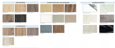 Los acabados, de Melamina, laminado, chapa y Marmoleado, solo se pueden aplicar al armzon, los cajones tienen que ir en lacado, puede ser mate, brillo o supermate.