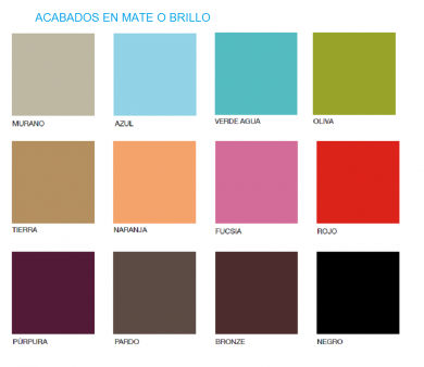 Se puede elegir tres tipos de acabados, mate o acabado en brillo o chapa, segun carta de colores adjunta, también puede combinar los colores del casco y las puertas y el tirador en cualquier color.