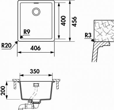 Medidas de encastre Bajo Encimera: 350 x 400 mm (R=9)