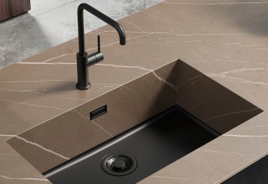 Cubeta bajo encimera en color negro, diseñada para integrarse perfectamente con el mismo material de