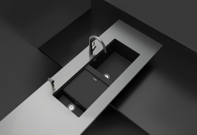 El diseño del fregadero combina líneas rectas y acabados oscuros, pensado para integrarse en espacios