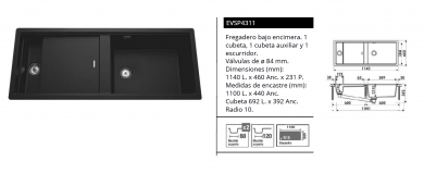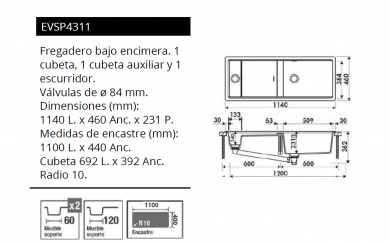 Fregadero bajo encimera. 1 cubeta, 1 cubeta auxiliar y 1 escurridor