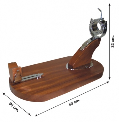 Soporte jamonero giratorio de primera calidad, acabado en madera de Sapelly. La base del jamonero tiene la forma redonda en ambos lados y el soporte para la pata del jamón va sujeto a la base mediante una pletina cromada con la forma de una bellota, ademas incluye una "v" corredera que se puede fijar en varias posiciones, según el tamaño del jamón.
