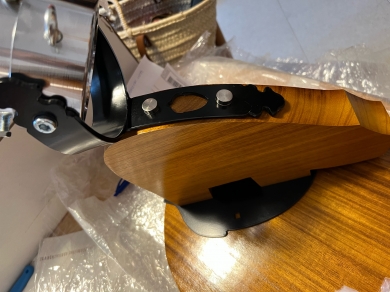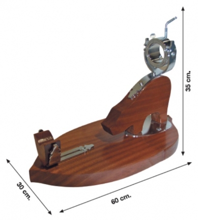 Soporte jamonero giratorio de primera calidad acabado en madera de Sapelly. La base del jamonero tiene la forma de una bellota, el soporte para la pata de jamón va sujeto a la base por una pletina negro con la forma de una bellota, además incluye una "v" corredera que se puede fijar en varias posiciones, según sea el tamaño del jamón.
