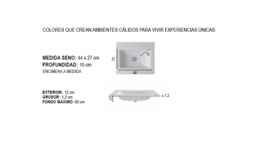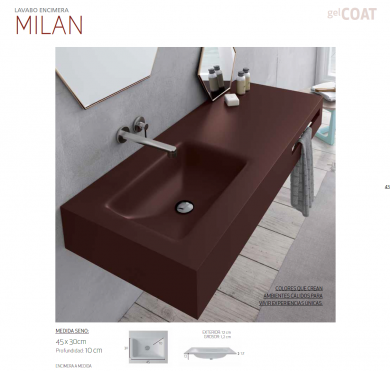 Lavabo Milan.Fabricado en Gel-coats , resina de poliester, cuarzo y cargas minerales, sanitario actibacterias, el producto en composite que mejor se adapta para estar con el agua caliente ( 60º ) ó a temperatura ambiente.