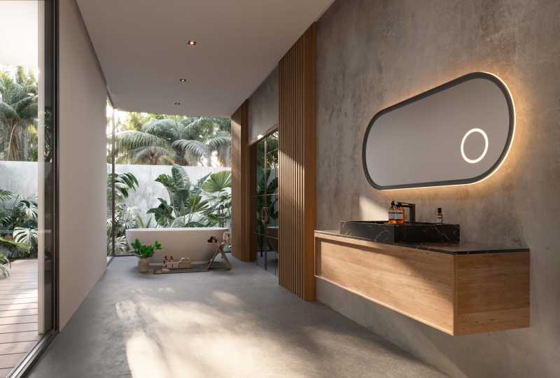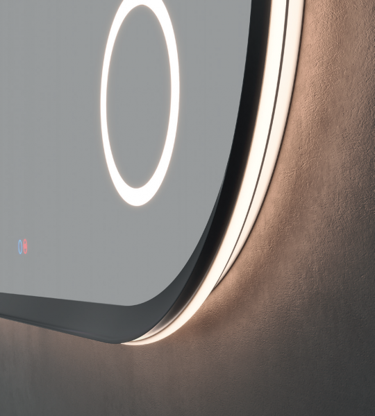 Espejo elíptico, con doble tira led retroiluminada y perimetral.