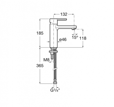 Mezclador monomando para lavabo con caño mezzo, cuerpo liso y enlaces de alimentación flexibles. No incluye desagüe clic-clac. Apertura en agua fría