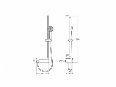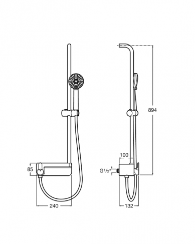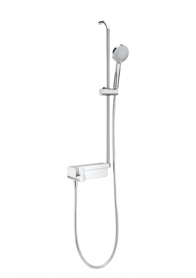 Columna monomando para con repisa. Incluye ducha de mano de ø 100 mm de 3 funciones, flexible de PVC satinado de 1,75 m y soporte articuladoregulable en altura,
