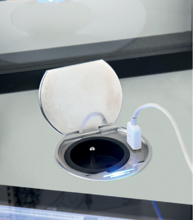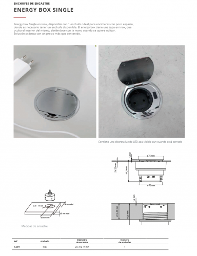 Nuevo Energy Box Single en inox, disponible con 1 enchufe o con 1 enchufe más 1 USB cargador. Ideal para encimeras con poco espacio, donde es necesario tener un enchufe disponible. El energy box tiene una tapa en inox, que oculta el interior del mismo, abriéndose con la mano cuando se quiere utilizar. Solución práctica con un precio más que contenido.