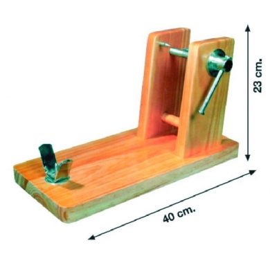 Soporte jamonero con la base rectangular y con soporte formado por dos brazos de madera movibles por un husillo que al girarlo sujetamos la pata de jamón.
