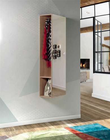 con amplio espejo de cuerpo entero detrás del cual hay dos estantes y un colgador.