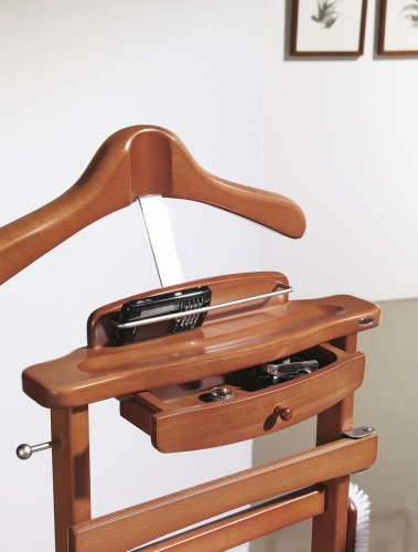 Fabricado en madera de haya y terminación con hierro cromado. Galán clásico muy elegante a la vez que práctico. Ideal para tu dormitorio. Con pequeño cajón incorporado.