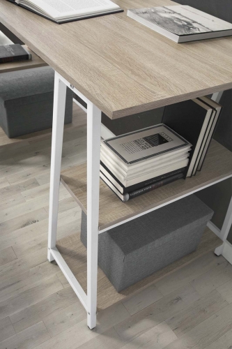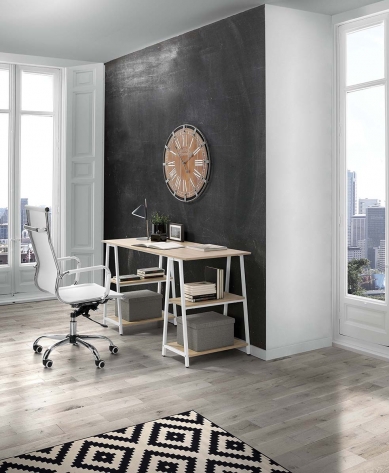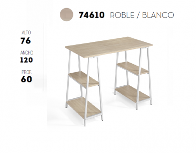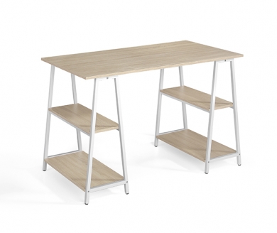 Mesa de estudio en melamina color roble y estructura en metal blanco que recuerda a las mesas con