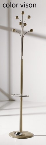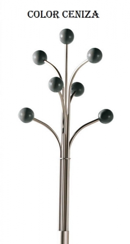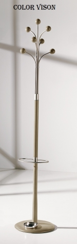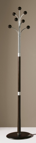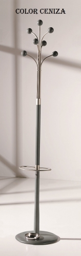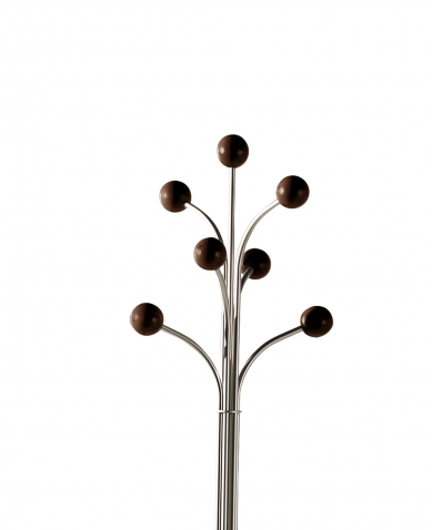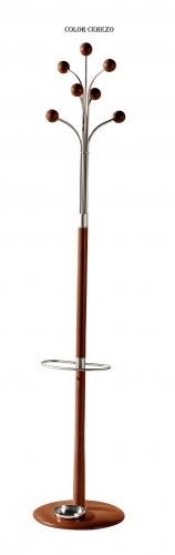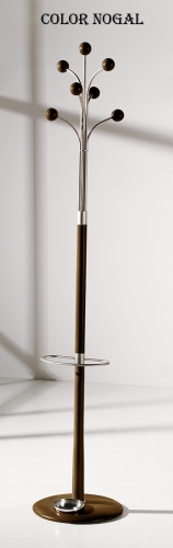 Perchero de pie de 189 cm de alto y 37 de ancho fabricado en madera de alta calidad con chapado natural o lacada y metal cromo satinado con 7 colgadores y soporte de paraguas