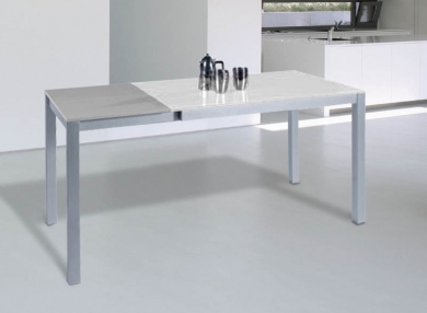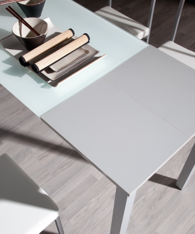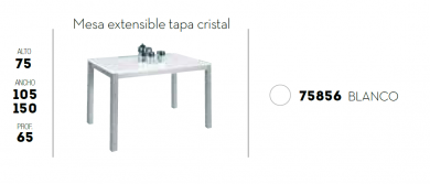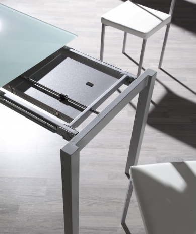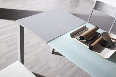 Mesa extensible fabricada con estructura metálica lacada en cromo mate y tapa de cristal templado color blanco. Ideal para cocinas o comedores.