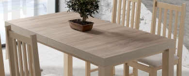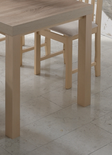 Mesa extensible de cocina fabricada con estructura y tapa de madera laminada chapada en melamina en 2 acabados a elegir. Sillas no incluidas.