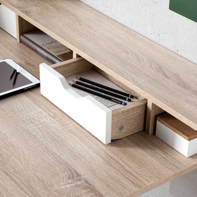 Escritorio de madera laminada en color roble y 2 cajones en color blanco