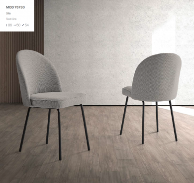Silla de comedor en textil gris con patas metálicas negras.