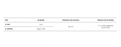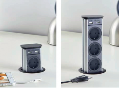 La nueva versión del Escamoteable Basic, es el Escamoteable Basic 2.0, Energy Box con 3 enchufes y 2 tomas USB cargadores disponible tanto con tapa en inox como con tapa en negro. El escamoteable tiene 2 posiciones de apertura, una primera donde queda visible y apto para su uso 1 enchufe y los 2 USB, y una segunda donde se muestran la totalidad de las tomas de enchufes.
