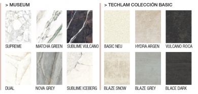Porcelánicos Muesum de 5mm y Techlam Lámina de 3 mm. con refuerzo de vidrio de 5 mm.