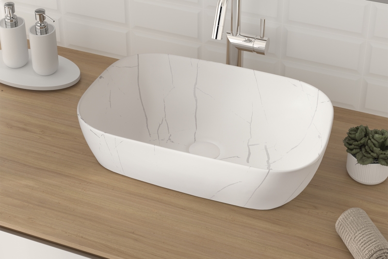 Lavabo de porcelana y mármol blanco con calca cerámica modelo Belice, diseñado para baños modernos y elegantes. Su acabado blanco y su seno