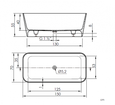 Bañera simétrica con desagüe central, rebosadero y sifón incluido.